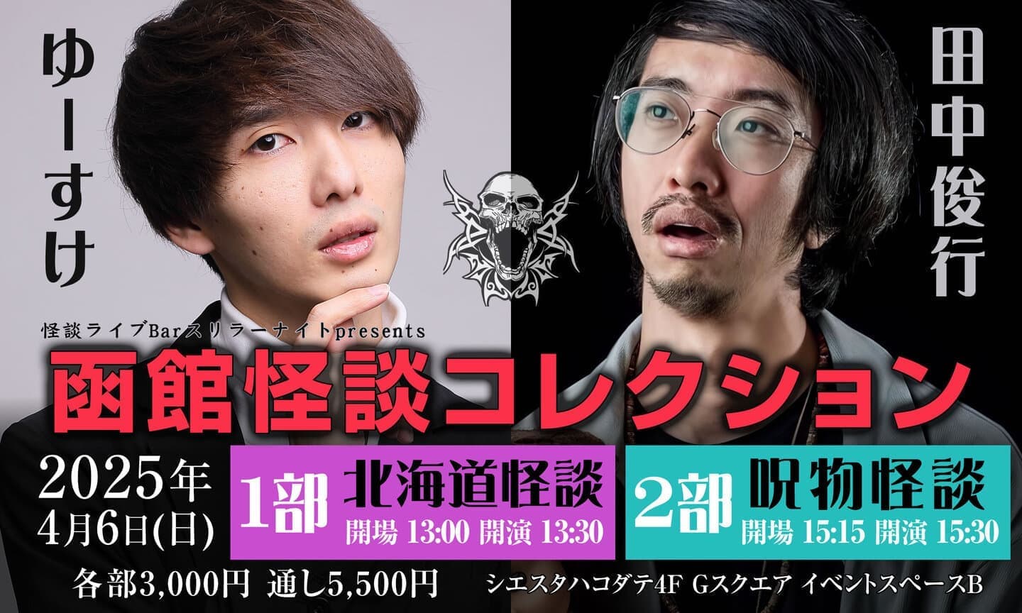 ゲストにオカルトコレクターの田中俊行さんをお招きし、すすきの店語り手ゆーすけと2人で函館では初の出張スリラーナイトイベントです!